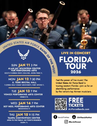 The US Air Force Band of the West concert band will be traveling to five cities in Florida to perform concerts for local communities and educators. These shows feature the exceptional talents of the nation’s finest Airmen musicians, and celebrate the works of American composers, including, ...